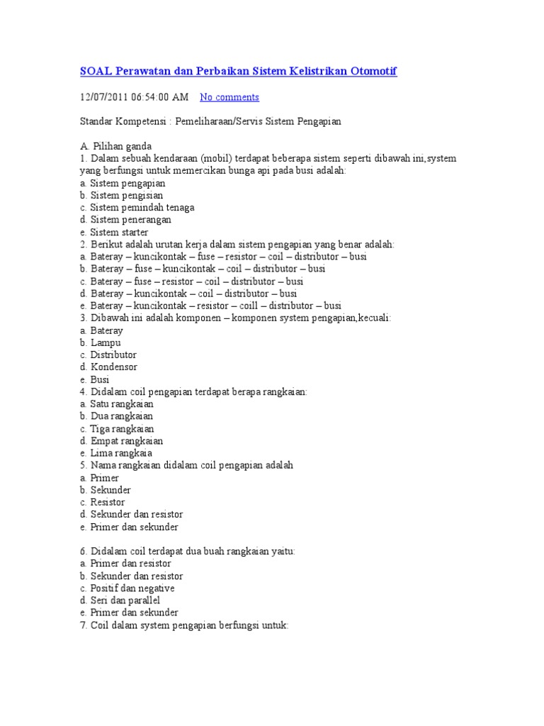 Soal Dan Jawaban Pemeliharaan Kelistrikan Kendaraan Ringan Kelas 12 : Soal Dan Jawaban Pemeliharaan Mesin Kendaraan Ringan Kelas 12 Cara Golden - Soal dan jawaban pemeliharaan kelistrikan kendaraan ringan kelas 12.. Soal dan jawaban pemeliharaan kelistrikan kendaraan ringan kelas 12. We did not find results for: Maybe you would like to learn more about one of these? Check spelling or type a new query.