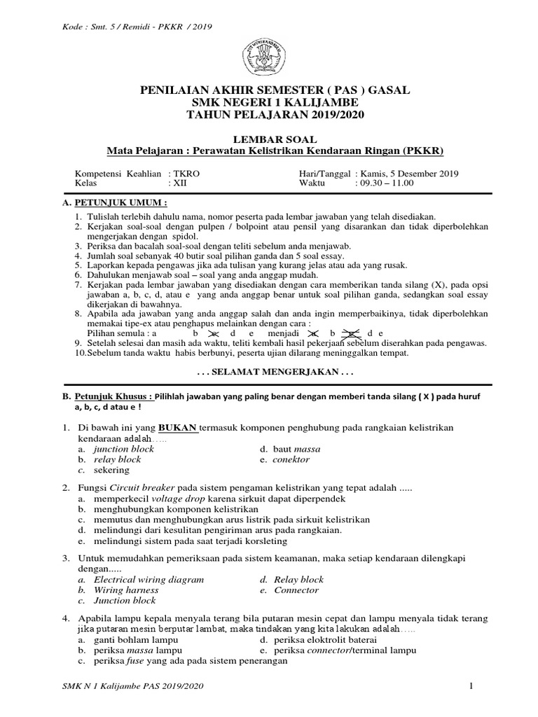 Soal Pkkr 2019 Kls Xii Remidi from imgv2-1-f.scribdassets.com We did not find results for: Maybe you would like to learn more about one of these? Check spelling or type a new query. Soal dan jawaban pemeliharaan kelistrikan kendaraan ringan kelas 12.